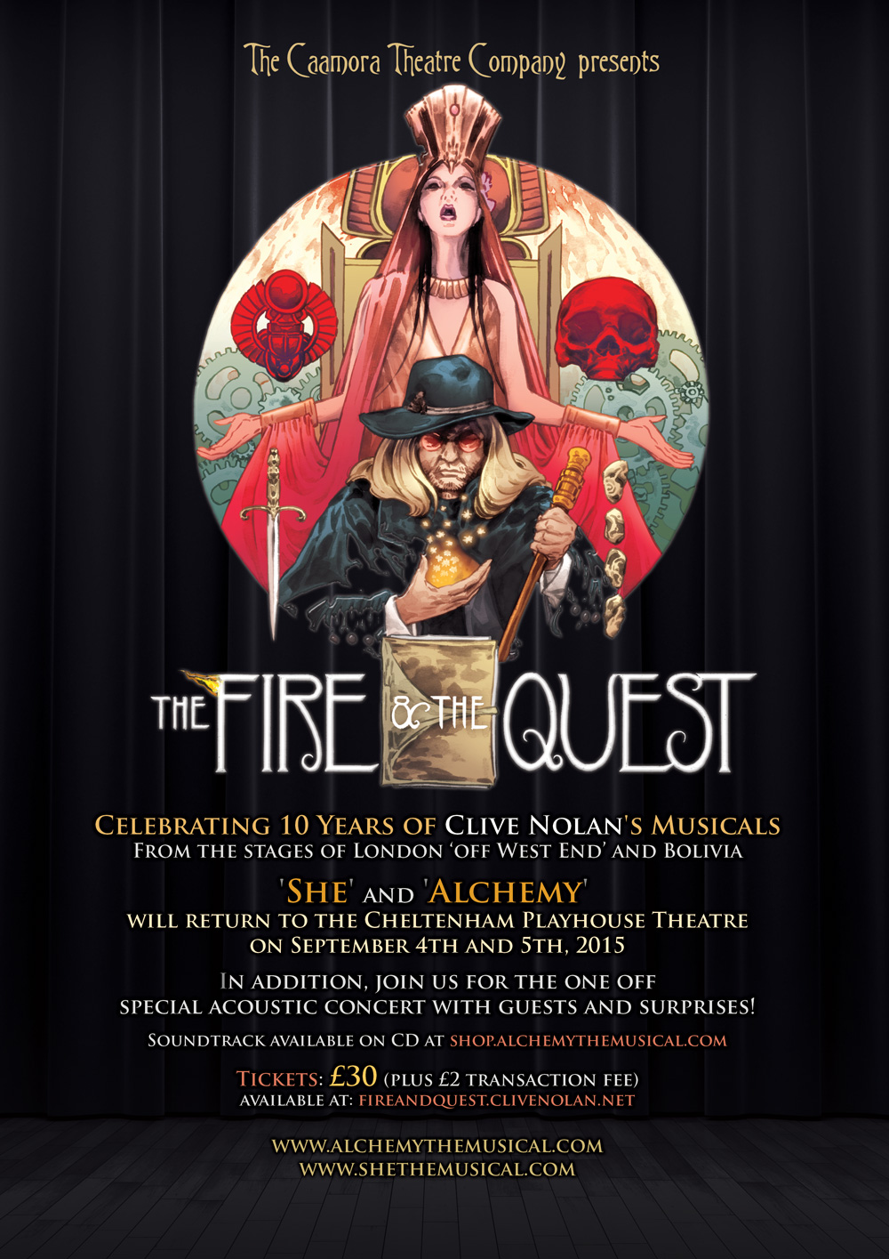 CN: Trudno uwierzyć, że to już dziesięć lat! Zaplanowaliśmy mini festiwal, który nazwaliśmy "The Fire and the Quest" - nazwa łączy elementy "She" i "Alchemy". Odbędzie się on we wrześniu w teatrze Playhouse w Cheltenham. Po raz kolejny wracam w moje rodzinne strony - tym razem z nowymi wersjami obu musicali. Wystawimy "She" w piątek, "Alchemy" w sobotę, a poza tym w sobotnie popołudnie zagramy akustyczny koncert z udziałem muzyków, którzy byli lub nadal są związani z moimi musicalami. Wiemy już, że pojawi się Christina Booth, Alan Reed, Paul Manzi. Kolejne nazwiska zostaną wkrótce potwierdzone.