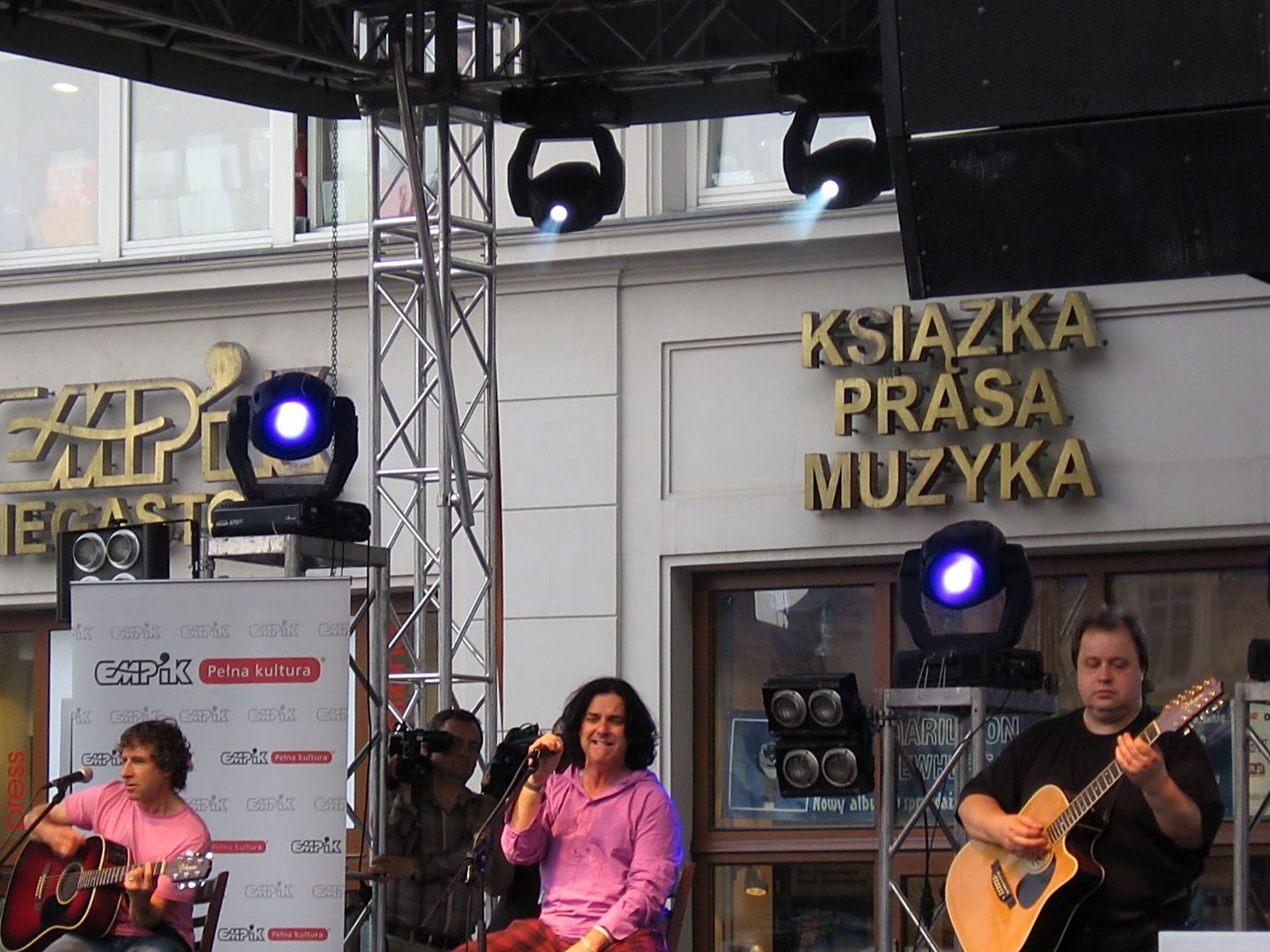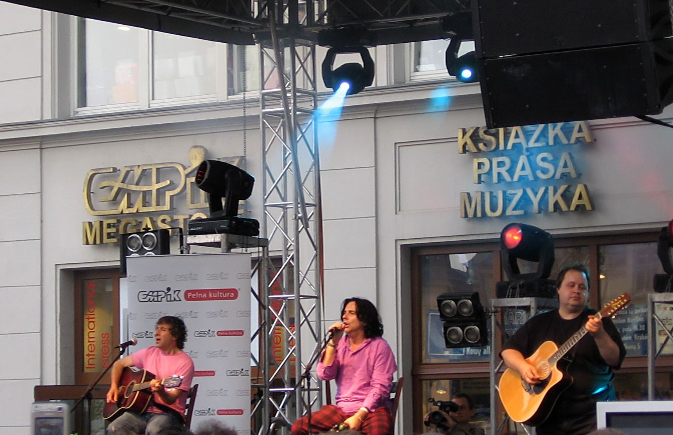 Zaczęło się od kilku kropel deszczu. Wycofałem się więc z pomysłu dotarcia na krakowski Rynek przy pomocy dwóch kółek, i tym samym spóźniłem kilka minut. Wiadomo – komunikacja samochodowa trochę trwa. Firmowany przez scenę EMPiKu koncert akustyczny był sympatycznym majowym piknikiem – ani specjalnie przemyślanym, ani specjalnie przygotowanym. Wedle zasady „rzuć Gwiazdę na żywioł, jakoś sobie poradzi”. Więc radzili sobie, we trzech: Pete i Steve strunowo-akustycznie, a H „natural”, czyli gardłowo-grzechotkowo. Gdzieś w międzyczasie poskarżył się cichutko, że do dyspozycji miał być jeszcze fortepian, ale w zamian otrzymał niespodziewane „wsparcie perkusyjne”, jako że remont płyty Rynku trwał w najlepsze i łupano czym się dało – kilofy, wiertarki, koparki – do wyboru, do koloru (tak, jakby nie można było skrócić dniówki o godzinę…).