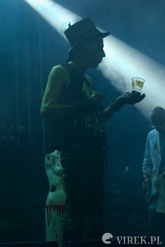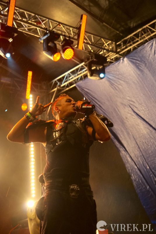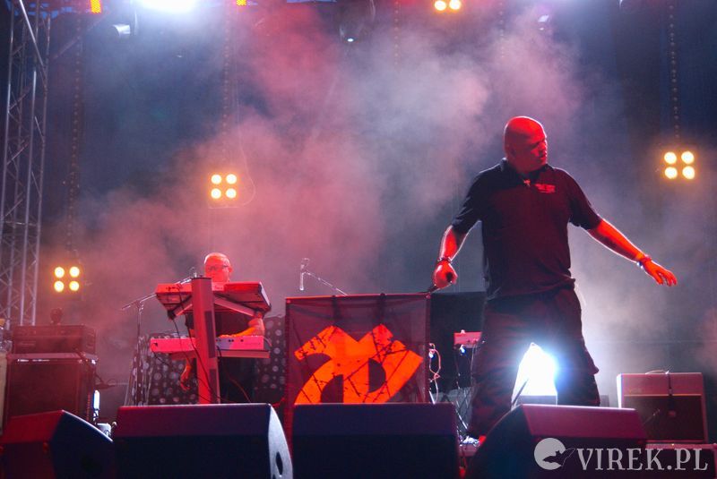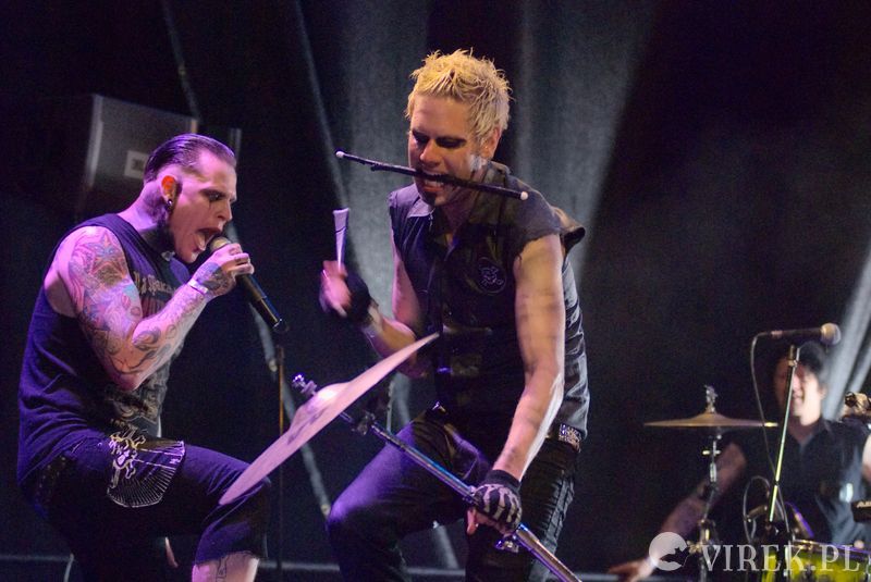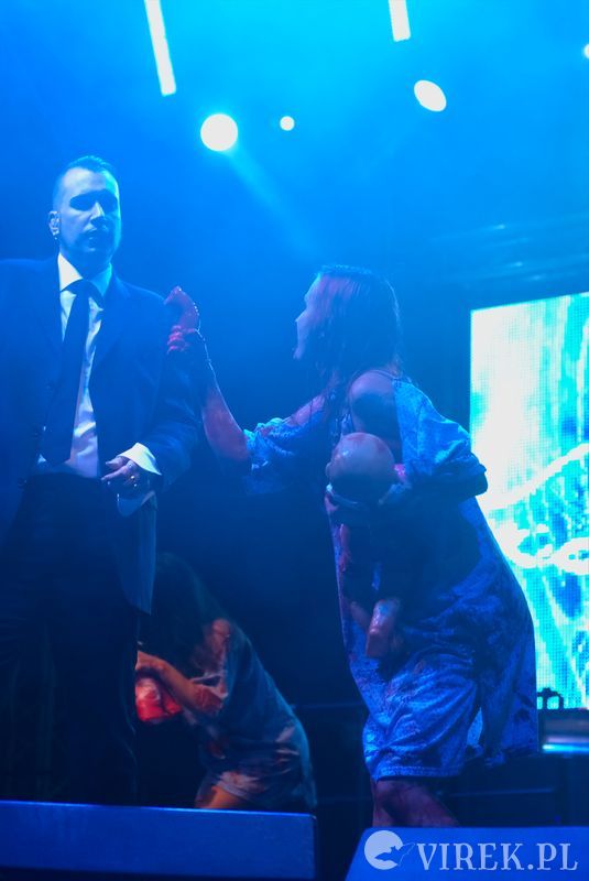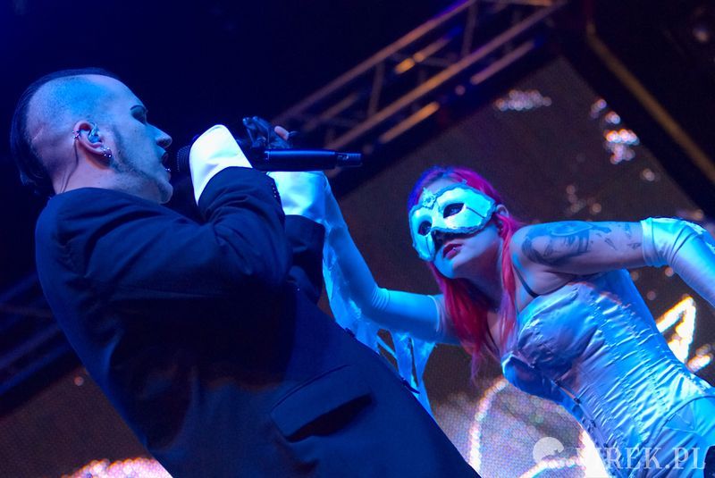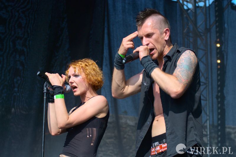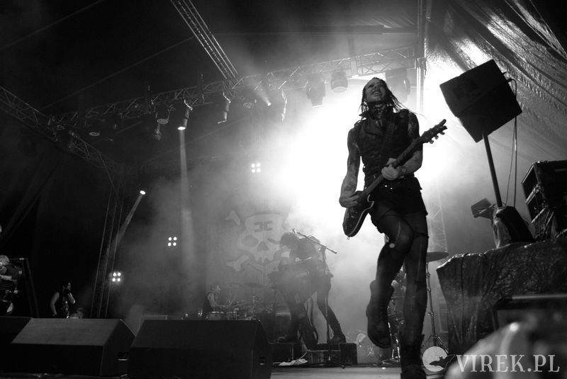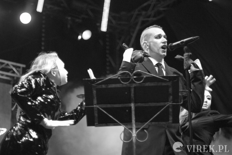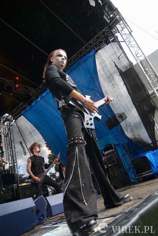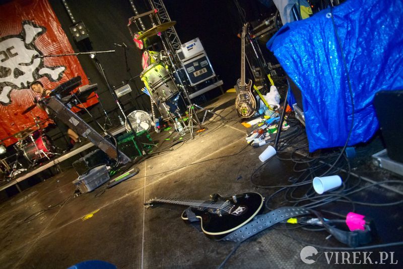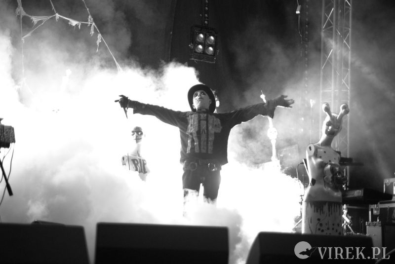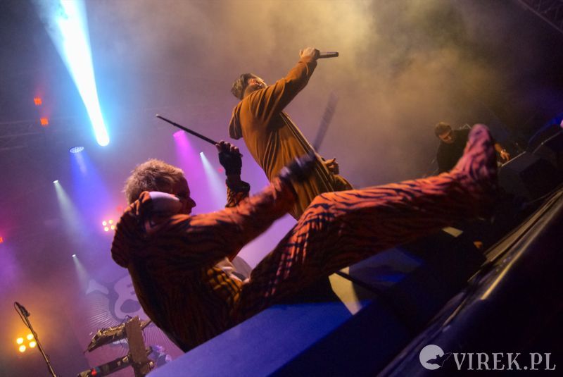 Najpierw na scenę wyszli niemieccy synth-popowcy z zespołu Blutengel. O ile zespołem można nazwać troje wokalistów. A gdzie zespół? Zespół się ukrył w konsolecie. Po chwili było wiadomo czemu na scenie zabrakło dla nich miejsca. Utwory urozmaicały tańcem i lekko erotyzującymi prezentacjami piękne panie. Coś w rodzaju zeszłorocznego Umbra Et Imago, lecz i panie nie emanowały tak nagością, jak i muzyka spokojniejsza. I już myślałem że to największy show tego wieczoru, czy nawet festiwalu, gdy na scenę wyszedł ostatni z zespołów. Wróć. Nie wyszli. Na scenę wpadło stado zwierząt i eksplodowało muzyką niczym granat ręczny. Perkusista pierwsze co zrobił to swój kocioł zrzucił ze sceny, zaniósł w publiczność by trzymała a sam szaleńczo zaczął wybijać rytm. Reszta zespołu nie była gorsza, w muzycznym szale walili w instrumenty nie przejmując się że gitara wypięła się ze wzmacniacza, bębny pospadały ze stojaków a klawisze i samplery poprzewracały się. Techniczni biegali jak w ukropie starając przywrócić odpowiednie pozycje instrumentom, podłączając, mocując ponownie na stojakach, ale na niewiele się to zdawało - po chwili i tak lądowały na podłodze sceny. Po pierwszym utworze scena była jednym wielkim pobojowiskiem, jakby przepuszczono przez nią stado zwierząt, a to przecież był początek koncertu.Techniczni używając taśmy klejącej i opasek zaciskowych przywrócili miejsca pracy muzyków do stanu używalności i scena ponownie zapełniła się muzykami. Swoje zwierzęce stroje rzucili w publiczność, ale nie pozbawiło ich to zwierzęcego wnętrza - zagrali dziki koncert, bawiąc sie przy tym doskonale. Ot choćby perkusista grając, co chwilę odrzucał pałeczkę technicznemu i zaraz czekał, by ten mu ją odrzucił z powrotem. Techniczny klęczący za gitarzystą usiłujący podłączyć gitarę do wzmacnacza, a gitarzysta kompletnie się tym nie przejmujący. Klawiszowiec biegający po scenie z talerzem perkusyjnym i naparzający w niego, a w tym czasie techniczni ponownie ustawiający jego zestaw bębnów - większość muzyków grała na kilku instrumentach. Występ zespołu przyćmił wszystkie inne koncerty festiwalu, zupełnie nie spodziewałem sie takiego show.