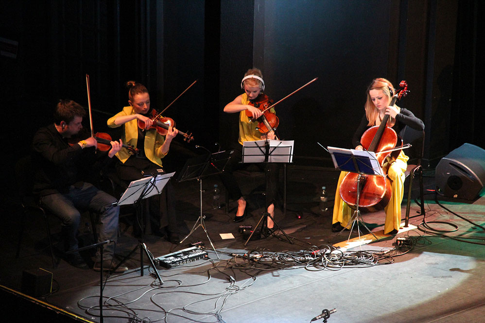- Kompozycje – długie wieloczęściowe utwory, w większości brzmiące totalnie abstrakcyjnie, z niezwykle zróżnicowaną rytmiką, tempem, dynamiką, harmonią, ekspresją, oszałamiające bogactwem intonacji, pomysłów brzmieniowych, karkołomnych pasaży granych solo, po kolei, w duetach, tercetach i kwartecie. Full wypas. Przy czym nie mamy znanego z wielu progresywnych kapel wrażenia popisu i przerostu formy nad treścią. Ta była muzyka do słuchania, emocjonalna, wciągająca w swoją opowieść, a jednocześnie niemal pozbawiona znajomych wątków i strategii. Dłuższe fragmenty brzmiały jak wyimprowizowane przez szalonych i dziwnie zestrojonych ze sobą maniakalnych muzyków. Słowem miód. Na symbolicznie nagłosnionych smyczkowcach nie można napi..dalać (ani na wibrafonie), ale nie znaczy to, że muzyka była pozbawiona dobrej dynamiki. Uderzenia wielotonowych akordów i piorunujące galopy bywały wściekłe, a z drugiej strony najcichsze piano, szmery, długie nuty (nuta nie może być dłuższa od długości smyka pomnożonej przez prędkość smykowania) emanowały spokojem i wyciszeniem. W dodatku kompozytorzy nie stronili od rozwiązań sonorystyczych – szurania smykiem wzdłuż strun, stukania dłonią w struny, pudełko itp. Ważne jest, że te wynalazki zostały wpisane w partyturę, tak jak inne nuty.