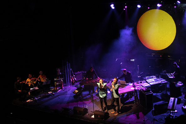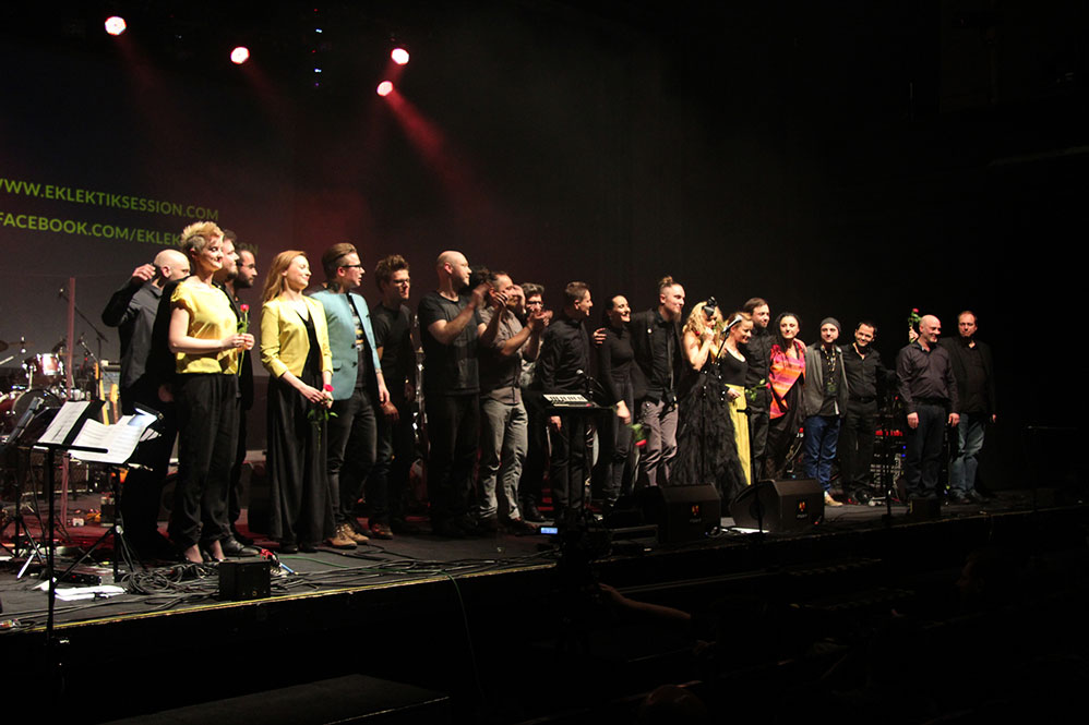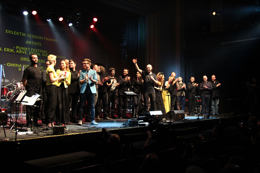 Nie zmienia to faktu, że koncert był bardzo udany. Mając ogólną formułę muzyczną zbliżoną do Eklektik Ensemble z dnia pierwszego (jazzy/trippy/electronic), Orchestra zatrudniła znacznie więcej ludzi (na szczęście nie wszyscy grali w tym samym czasie), więc było bogaciej, bardziej różnorodnie, potężniej. Cały design dźwięku również odzwierciedlał finałowość i kosmiczny rozmach. Momentami było potężnie, momentami ostro. W wielu utworach bębny brzmiały wręcz stadionowo i można było odnieść wrażenie, że koncert jest wydarzeniem zaplanowanym na większą przestrzeń i publiczność. Także dobór repertuaru, tym razem w większości piosenkowego i rozpoznawalnego (covery) kierował się bardziej na powszechniejsze gusty, choć nie masowe. Massive Attack, Portishead, Young Gods, niszowe ikony lat 90. otrzymały należny hołd. Świetnie, że znalazł się w tym towarzystwie Miles Davis (Shh-peaceful) i to znakomicie wykonany, może nie bardzo jazzowo, ale za to z dużym feelingiem i świetną aranżacją i ciekawymi partiami solowymi (puzon!). Nie będąc znawcą nie rozpoznałem kilku innych piosenek, wykonywanych z profesjonalną swobodą. Nie wszystkie moim zdaniem były trafione, niektóre duety wydawały się nieco żmudne, ale aranżacje były urozmaicone, a muzycy pierwszoklasowi – było czego posłuchać. Wokaliści generalnie nie zawiedli, nie wiem kogo bym wyróżnił, Natalia Lubrano i Adrianna Styrcz w duecie chyba uwiodły mnie najbardziej, ale panowie Andrzej Strzemżalski i Szymon Danis także pokazali klasę. Znalazł się też w programie typowo acid jazzowy dłuższy kawałek instrumentalny z wręcz bossanowowymi motywami. Z drugiej strony były momenty o wręcz dubstepowej wymowie. Tomasz Gwinciński zaśpiewał zaskakująco dobrze „Our House” The Young Gods, zagrał też parę gitarowych perełek. Kwartet smyczkowy stanął na wysokości zadania, Arve H. był jak zwykle niezawodny, trąbił, śpiewał, szeleścił do swojego instrumentu, a Jan Bang jak zwykle się bujał szatkując dźwięki. Nie miał jednak takiego pola do popisu jak w mniejszych grupach gdzie live sampling może mocno kształtować stylistykę, wmiksował się idealnie w aranżacje i tylko czasem zbijał z pantałyku przedłużając partię jakiegoś instrumentu o parę taktów, lub kompresując nagle całą frazę do industrialnego terkotu. Dramaturgia koncertu była dobrze zaplanowana, pomiędzy dłuższymi utworami pojawiały się budujące nastrój intra. Znakiem firmowym koncertów z serii Eklektik jest doskonała realizacja dźwięku, co przy takim bogactwie i ilości wykonawców i instrumentów jest sztuką samą w sobie. Brawa, Mr. Roli Mosimann!