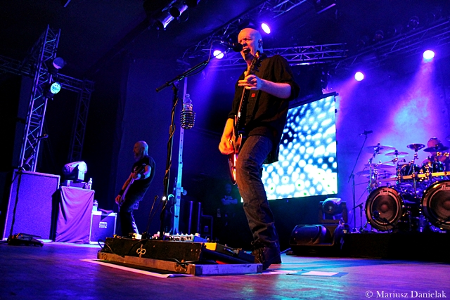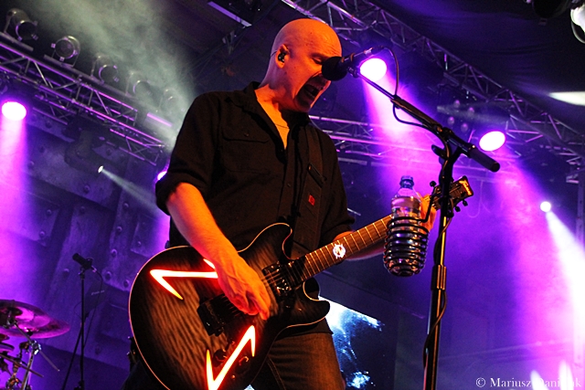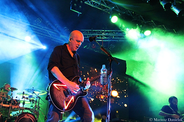 Townsend wyszedł na scenę z towarzyszącymi mu muzykami (Dave’m Youngiem na gitarze, Ryanem Van Poederooyenem na bębnach, Brianem Waddellem na basie i Mikiem St-Jeanem na klawiszach) parę chwil przed planowaną 21. Witany po królewsku najpierw odwzajemnił się ukłonami i podziękowaniami po czym przeszedł z kapelą do rzeczy zaczynając od ciężkiego Truth z Infinity i kończąc obowiązkowym Kingdom. Trwający tylko godzinę i 10 minut set miał bardzo przekrojowy i reprezentatywny charakter, o ile w przypadku Devina, bawiącego się różnymi stylistykami, można mówić o reprezentatywności. Były zatem rzeczy z Epicloud, Addicted, Physicist, Ocean Machine: Biomech, czy Ziltoid The Omniscient. Sam cieszyłem się ogromnie z pięknego i majestatycznego Storm z jednego z moich ulubionych krążków Devina, Accelerated Evolution. Najwięcej numerów reprezentowało oczywiście ubiegłoroczne płyty z sunącym do przodu Fallout i niesamowicie wzniosłym A New Reign na czele. Ten ostatni, choć pozbawiony żeńskiej wokalizy, był dla mnie jednym z ważniejszych momentów koncertu. Townsend nie zszedł ani razu ze sceny, choć za bis można uznać wspomniany Kingdom. Tuż przed nim bowiem zespół opuścił deski Stodoły, a Devin tylko z gitarą i dużą pomocą wokalną zebranych wykonał Ih-Ah!. Wyrazistości temu niedługiemu spektaklowi dodawały dwa pomieszczone po bokach telebimy i solidne, choć nie w każdym miejscu sali, brzmienie.